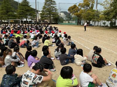 校長先生からも講評をいただきました。「オハシモテ」の合言葉を教えてもらいました。すでに知っている子どもがほとんどでした。全校のみんなに問いかけます。